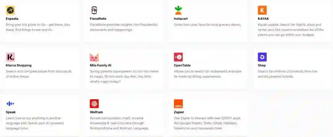 OpenAI 的解决方案是用第三方插件作为桥梁,让 AI 在较安全的环境下「看」外界数据。昨天该机构开放了第一批 ChatGPT 插件名单。这批插件由 Expedia、FiscalNote、Instacart、KAYAK、Klarna、Milo、OpenTable、Shopify、Slack、Speak、Wolfram 和 Zapier 创建。