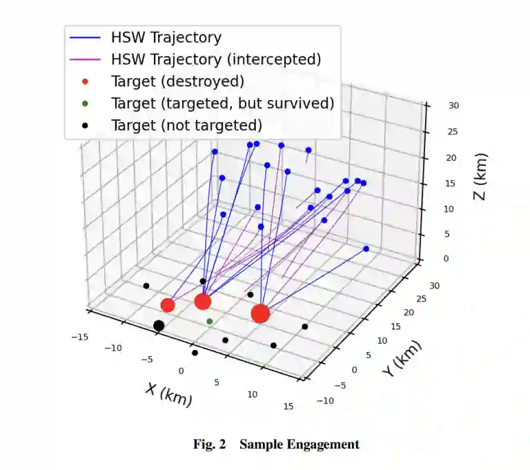 以往关于 WTA 问题的研究包括 [4],该文概述了解决该问题的不同方法。在文献[5]中,作者讨论了一个有多个目标、防御者和导弹的场景(与本文讨论的场景类似),并使用了一种邻接系统表示法来评估将武器分配给目标的特定方案的优劣。然而,计算大约需要一个小时,因此不适合高超音速攻击的实时实施。文献[6]介绍了一种 WTA 求解器,该求解器使用修改过的成本函数来确保武器同时到达目标,但没有考虑目标的防御措施,也没有与最优解进行比较,而且对于高超音速打击应用来说计算成本可能过高。在文献[7]中,作者比较了不同的成本函数和优化算法,同时考虑了武器损耗和目标可行性。最后,在文献[8]中,作者使用强化学习来解决防御应用中的静态 WTA 问题。结果表明,他们的 WTA 策略性能超过了非最佳基准,但尽管该策略可以泛化到不同数量的目标,却无法泛化到不同数量的武器。