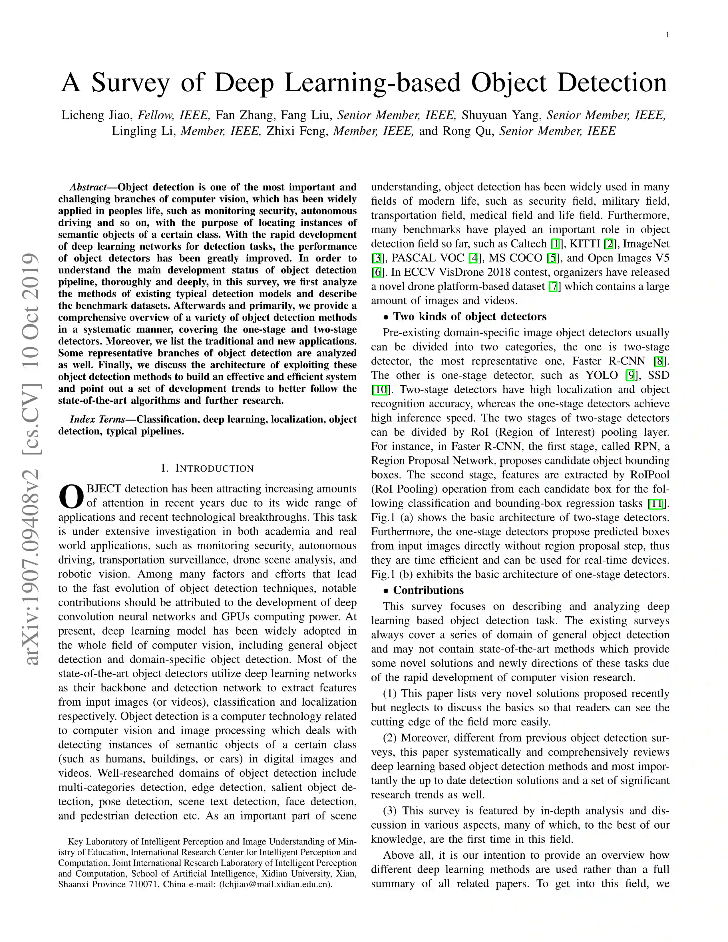 论文摘要: 目标检测是计算机视觉中最重要和最具挑战性的分支之一,它已广泛应用于人们的生活中,例如监视安全性,自动驾驶等。随着用于检测任务的深度学习网络的迅速发展,对象检测器的性能得到了极大的提高。为了深入地了解目标检测的主要发展状况,在本次调查中,我们首先分析了现有典型检测模型的方法并描述了基准数据集。之后,我们以系统的方式全面概述了各种目标检测方法,涵盖了一级和二级检测器。此外,我们列出了传统和新的应用程序。还分析了对象检测的一些代表性分支。最后,我们讨论了利用这些对象检测方法来构建有效且高效的系统的体系结构,并指出了一组发展趋势,以更好地遵循最新的算法和进一步的研究。