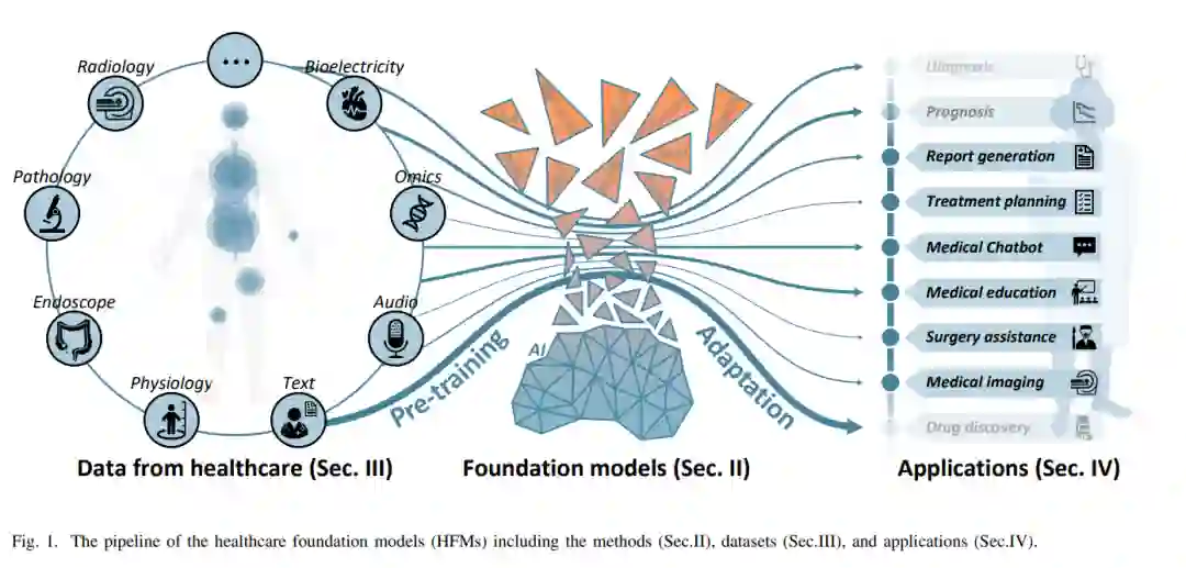 本综述提供了对医疗基础模型的洞察,我们的贡献如下列出: 1. 方法的系统回顾(第二节):从2018年到2024年(1月-2月)涉及HFMs的200篇技术论文被纳入本综述。我们为这些论文提出了一个新的分类,并在语言、视觉、生物信息学和多模态子领域的预训练和适应方面进行了回顾。它为医疗基础模型的潜在技术创新提供了洞察。 1. 数据集的全面调查(第三节):我们调查了HFM培训可能使用的四个子领域中的114个大规模数据集/数据库。它识别了医疗数据集当前的限制,并为HFM研究人员提供了数据资源指导。 1. 应用的全面概述(第四节):我们概述了当前HFM作品中的16个潜在医疗应用。它展示了HFM技术在医疗实践中的当前发展,为未来在更多场景中的应用提供了参考。 1. 关键挑战的深入讨论(第五节):我们讨论了与数据、算法和计算基础设施相关的关键挑战。它指出了HFM当前的不足,为研究人员提供了新的机会。 1. 对新兴未来方向的远见探索(第六节):我们期待HFM在其角色、实施、应用和重点方面的未来方向。它显示了医疗AI从传统范式到基础模型时代的转变,突出了在推动该领域发展方面具有前景的未来观点。