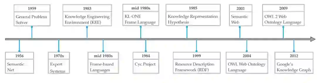 知识表示在逻辑和人工智能领域经历了漫长的发展历史。图形化知识表示的思想最早可以追溯到1956年Richens[127]提出的语义网概念,而符号逻辑知识可以追溯到1959年的一般问题求解者[109]。知识库首先用于基于知识的推理和问题解决系统。MYCIN[138]是最著名的基于规则的医学诊断专家系统之一,知识库约有600条规则。后来,人类知识表示的社区看到了基于框架的语言、基于规则的表示和混合表示的发展。大约在这个时期的末期,Cyc项目开始了,目的是收集人类的知识。资源描述框架(RDF)和Web本体语言(OWL)相继发布,成为语义Web的重要标准。然后,许多开放知识库或本体被发布,如WordNet、DBpedia、YAGO和Freebase。Stokman和Vries[140]在1988年的图表中提出了结构知识的现代概念。然而,自2012年谷歌搜索引擎首次提出知识图谱概念以来,知识图谱得到了极大的普及,当时提出了知识库[33]的知识融合框架来构建大规模的知识图谱。附录A说明了知识库历史的简要路线图。
