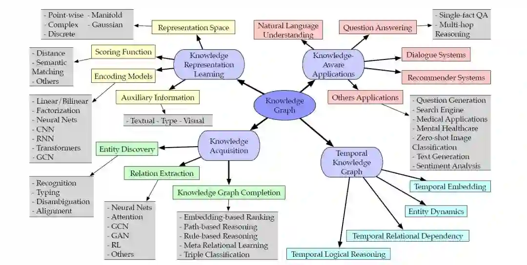 近年来,基于知识图谱的研究主要集中在知识表示学习(KRL)和知识图谱嵌入(KGE)两个方面。具体的知识获取任务包括知识图谱补全(KGC)、三元组分类、实体识别和关系提取。知识感知模型得益于异构信息、丰富的知识表示本体和语义以及多语言知识的集成。因此,许多现实世界的应用,如推荐系统和问题回答已经具备常识性的理解和推理能力。一些现实世界的产品,例如微软的Satori和谷歌的Knowledge Graph,已经显示出提供更高效服务的强大能力。