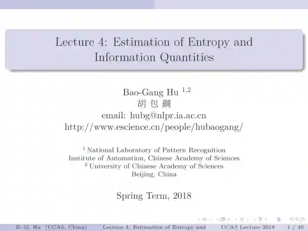 第17-22页: 在第一章中我们介绍了美国佛罗里达大学Principe教授是国际上首次提出“信息论机器学习(ITL)”理论框架的学者。基于此框架他们团队发展了许多基础性的原创工作。这里主要是他们关于二次Renyi熵中的部分贡献。其中从物理视角提出信息势、信息势场、信息力的定义(第19页),并与二次Renyi熵建立关联的学术思想十分重要并具启迪性。本人理解这是对机器学习从信息论角度提供解释性的重要基础。其中给我的启迪是未来要打通机器学习、信息论、物理原理之间的关联。第22页中的要点也可以理解为熵估计方法中期望的性质。