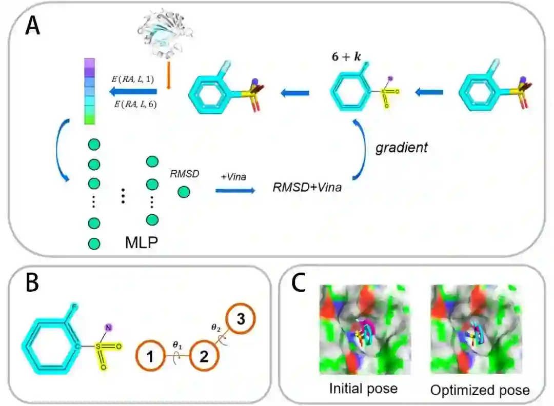 在评估对接能力时,一般认为RMSD(小分子的方均根偏差)越小的结合姿势具有更大的结合亲和力。因此,对于同一个蛋白质-配体复合物的不同结合状态,RMSD值可以近似成表征亲和力大小的另一种形式。论文作者提出的DeepRMSD是一个预测配体结合姿势RMSD的打分函数,将其与AutoDock Vina打分函数相结合 (DeepRMSD+Vina) 可以实现更高的对接成功率。鉴于DeepRMSD+Vina是对配体坐标完全可导的,因此基于该打分函数应用梯度回传构建了一个配体构象优化框架。