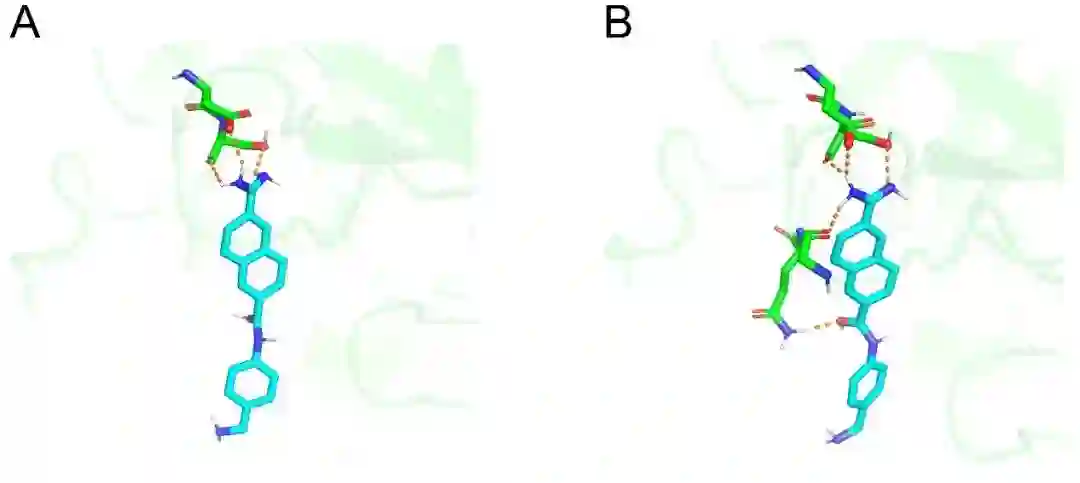 图5. 结合姿势 (PDB: 1OWH) 优化前后氢键形成情况。青色表示配体结合姿势,绿色与配体形成氢键的关键残基,橙色虚线表示氢键。