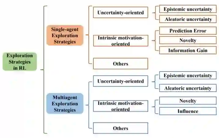 三类探索算法。该综述⾸次提出基于⽅法性质的分类⽅法,根据⽅法性质把探索算法主要分为基于不确定性的探索、基于内在激励的探索和其他三⼤类,并从单智能体深度强化学习和多智能体深度强化学习两⽅⾯系统性地梳理了探索策略。