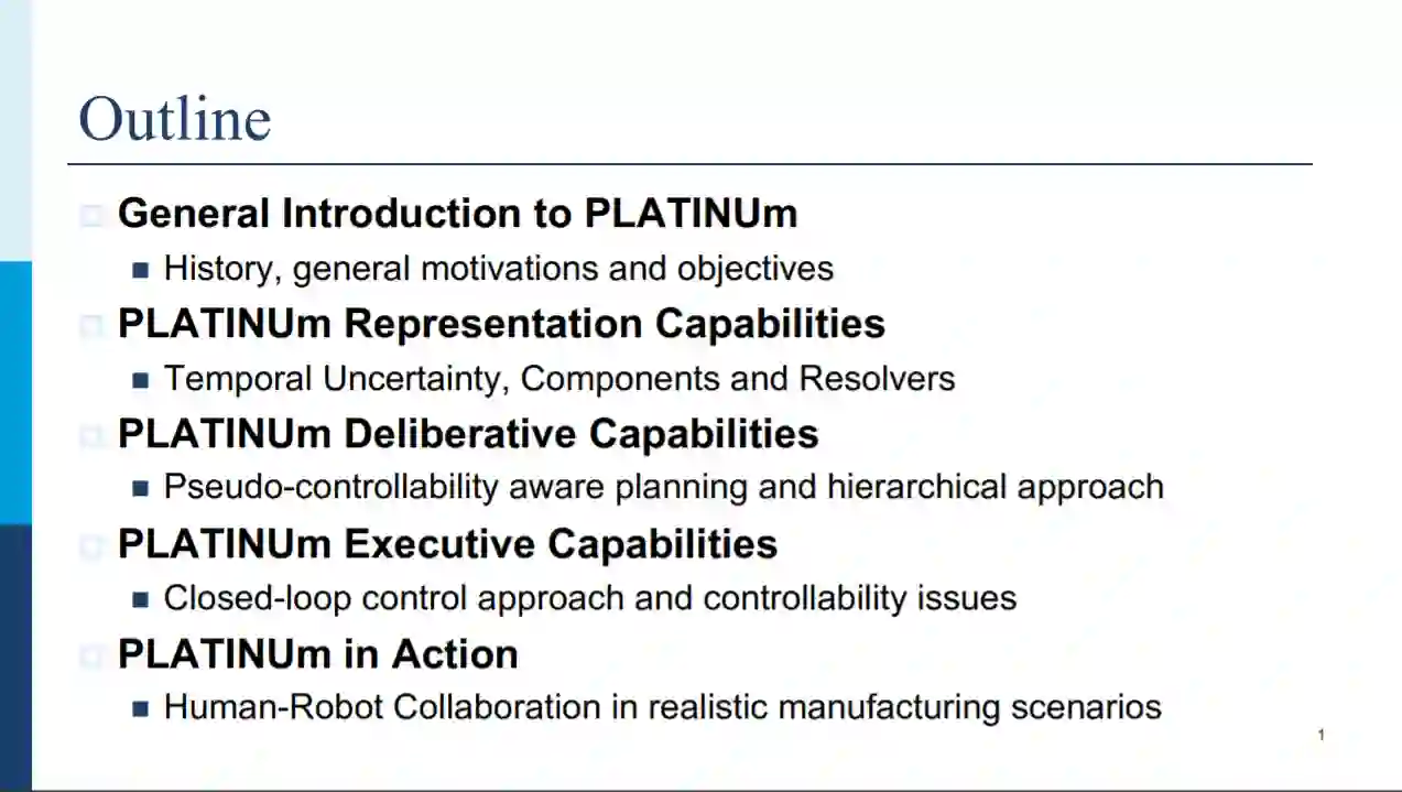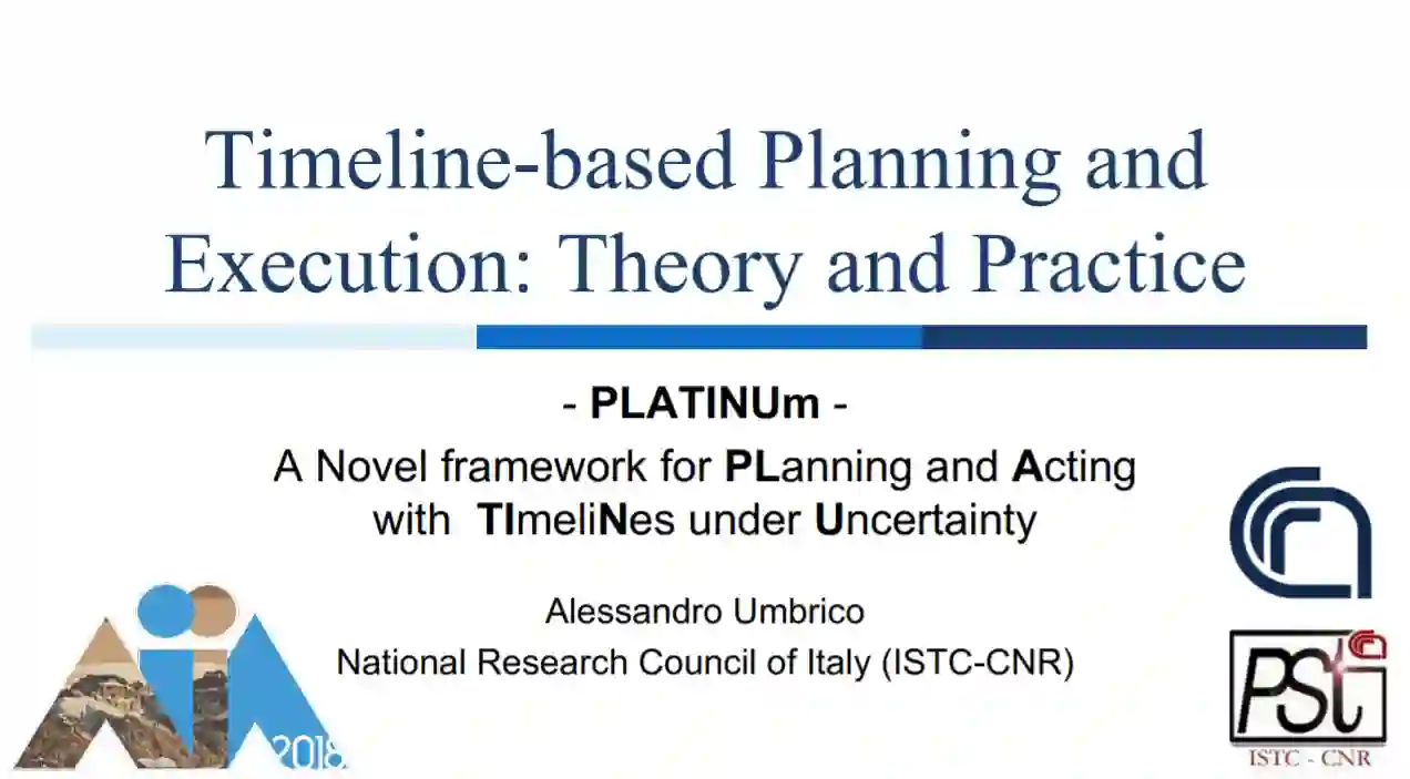 本教程介绍了基于时间轴的规划方法。在简要回顾了该方法的发展历史之后,将其与常见的基于行动的规划形式主义(如PDDL)进行了比较。然后,详细描述了该领域的理论和应用的最新发展以及研究的挑战。最近引入的PLATINUm框架被描述为一类基于时间轴的规划系统的代表,并详细描述了最近关于基于时间轴的语言的表达性和基于时间轴的问题的计算复杂性的理论结果。