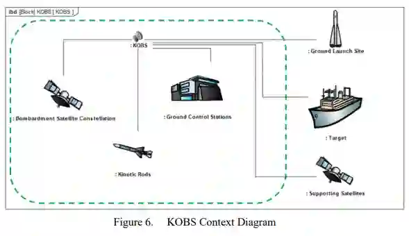 开发了详细的系统工程设计架构,涵盖利益相关者分析、系统组成、需求定义、任务分析与效能评估。通过Magic体系架构系统(MSOSA)创建的系统设计构件实现了架构可视化,为未来设计者提供指导。动能轨道轰炸系统(KOBS)由轰炸卫星星座、动能杆与地面控制站构成,系统接口涵盖发射场、辅助卫星及目标。轰炸卫星物理分解为导航、发电与配电、推进、动能杆等子系统;动能杆子系统进一步分解为弹体、导航、制导控制、目标锁定与通信模块。系统需求追溯至性能指标(MOP),继而关联效能指标(MOE),通过量化评估使利益相关者判断系统是否达成作战目标与技术标准。此分析验证了KOBS的可行性与作战效用,为后续开发、集成与测试奠定基础。
