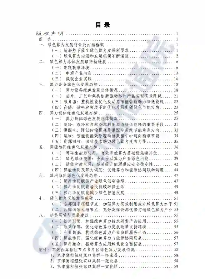 在算力设备绿色化方面,我国算力设备整体效能不断提升。 通过芯片制造封装工艺技术进步以及处理器架构创新提升单芯片性能,运用先进存储、存算一体、无损网络融合等技术促进计算存储网络协同等方式,我国算力设备整体效能不断提升。 在算力载体绿色化方面,我国数据中心单机架耗电量及 PUE 持续降低。 截至2023年底,我国数据中心810万在用标准机架总耗电量达到1500亿KWh,2023年全社会用电量92241亿千瓦时,数据中心在用标准机架总耗电量占全社会用电1.6%,数据中心碳排放总量为0.84亿吨。2023年我国数据中心平均电能利用效率(PUE)为1.48,与2022年的1.54相比有进一步下降。中西部地区绿色数据中心发展迅猛,入选“国家绿色数据中心”数量占比从第一批占比26.6%增长到第五批的占比46%。 在算能协同绿色化方面,积极探索多种方式推动算力和能源协同发展。 目前,我国积极探索通过算力布局选址靠近能源侧,提升可再生能源利用率、推进绿电和绿证交易、采用储能和微电网等先进技术以及建设综合能源与算力协同调度系统等方式推动算力和能源协调发展,当前我国数据中心参与绿电绿证交易规模持续扩大,算能协同发展仍有较大潜力空间。 在算用协同绿色化方面,不断推进绿色算力赋能千行百业。 在绿色算力的支撑下,数字技术与电力、工业、建筑、交通等重点碳排放领域深度融合,减少能源与资源消耗,促进传统产业能源优化、成本优化、风险预知及决策控制,整体上实现节能降本提质增效。在绿色算力发展带动下,新一代人工智能算力基础设施的包容性、普惠性安全性、共享性及节能性进一步增强,公共算力服务平台建设加快推进,算力的公共性与普惠性进一步带动数字化转型和智能化升级。 来源:中国信通院