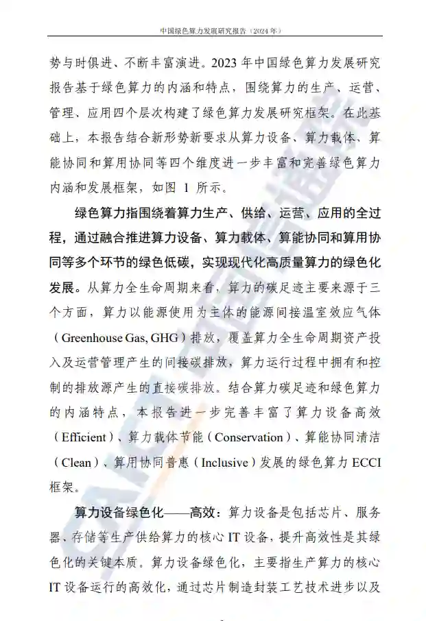 绿色算力是算力的绿色低碳发展追求,是算力高质量发展的重要目标,是一个动态演进的概念,其内涵和框架随形势与时俱进、不断丰富演进。报告结合新形势新要求,从算力设备、算力载体、算能协同和算用协同4个维度进一步丰富和完善了绿色算力内涵和发展框架,构建了算力设备高效(Efficient)、算力载体节能(Conservation)、算能协同清洁(Clean)、算用协同普惠(Inclusive)发展的绿色算力ECCI框架。以此为基础,报告对当前全球及我国绿色算力发展现状进行系统性梳理,深入探讨绿色算力在算力侧、能源侧、需求侧的技术创新发展情况,总结绿色算力技术赋能的典型应用场景以及绿色算力区域发展成效,最后展望我国绿色算力发展趋势,并提出下一步发展建议。