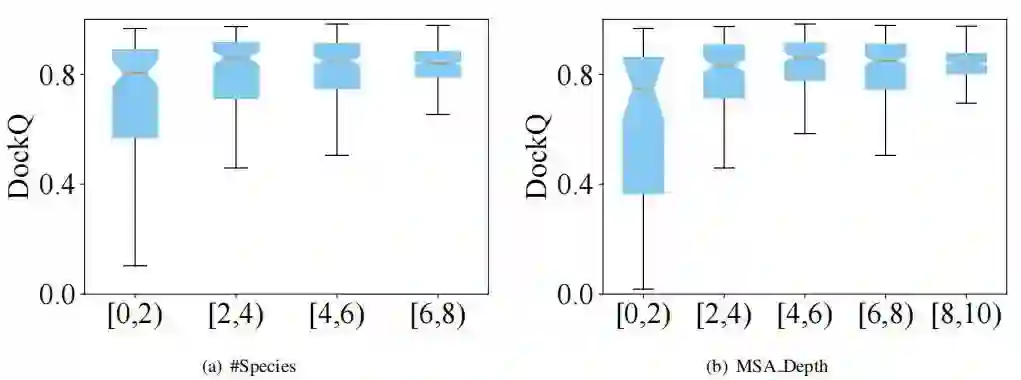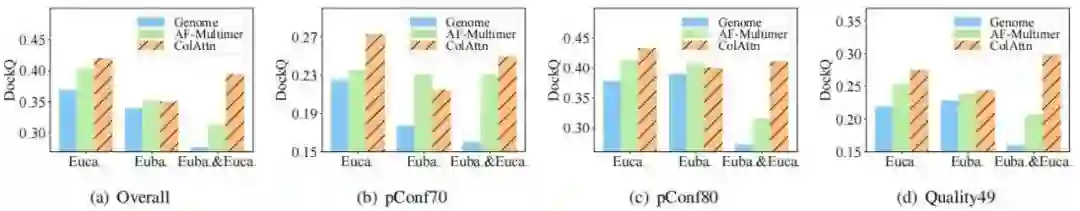 作者还比较了 ColAttn、AF-Multimer 和 Genome 方法在不同生物上的 DockQ 分布,如图 2 所示,结果显示 ColAttn 在真核生物上可以构建有效的间相互作用。