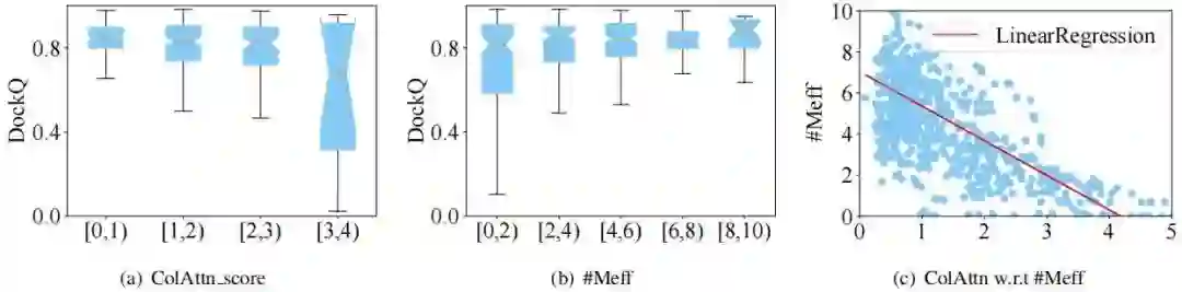 作者还研究了 ColAttn 与一些关键因素之间的联系,如列注意力得分(ColAttn_score)、有效序列的数量(#Meff)、物种数量(#Species)和 MSA 深度(MSA_Depth),结果如图 5 所示。