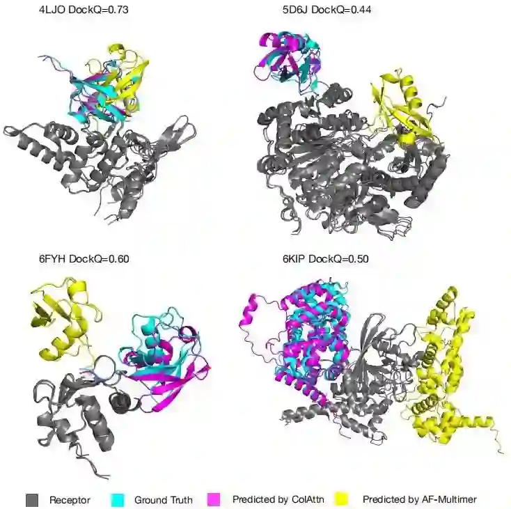 作者还可视化了 5D6H、6KIP、6FYH、4LJO 这 4 个 PDB 结构,如图 3 所示,结果显示用 ColAttn 方法能精准预测而使用 AlphaFold-Multimer 不能。