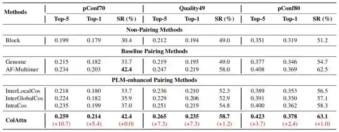 本文中,作者首次提出了 MSA 配对算法 ColAttn,该算法把蛋白语言模型的输出组合成联合 MSAs 形式,利用 MSA Transformer 中的注意力得分从单链中识别配对同源物。该方法在异二聚体上展现了最好的结构预测准确率。作者同时把 ColAttn 与其他的 MSA 配对算法进行结合,准确率得到了进一步提升。