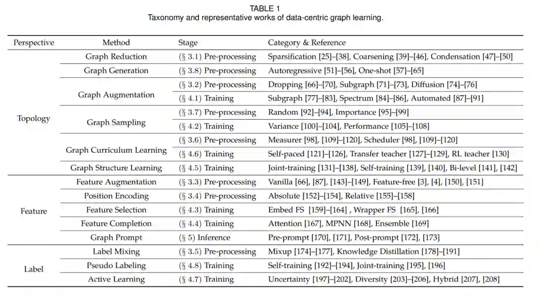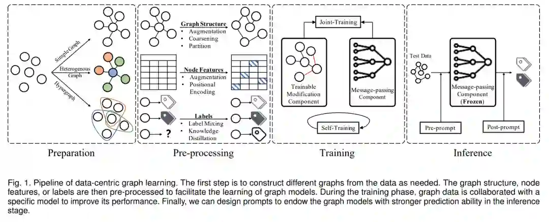 人工智能(AI)的历史见证了高质量数据对各种深度学习模型的重大影响,例如ImageNet对于AlexNet和ResNet。最近,AI社区的关注点已从设计更复杂的神经结构(即模型为中心的方法)转移到了数据为中心的方法,这种方法重点在于更好地处理数据以增强神经模型的能力。图学习,操作于无处不在的拓扑数据上,也在深度学习时代中起到了重要作用**。在这次综述中,我们从数据为中心的角度全面回顾了图学习方法,并旨在回答两个关键问题**:(1)何时修改图数据以及(2)如何修改图数据以发掘各种图模型的潜力。因此,我们提出了一个基于图学习流程中的阶段的新分类法,并强调了图数据中不同数据结构的处理方法,即拓扑、特征和标签。此外,我们分析了嵌入在图数据中的一些潜在问题,并讨论了如何以数据为中心的方式解决它们。最后,我们为数据为中心的图学习提供了一些建议的未来方向。