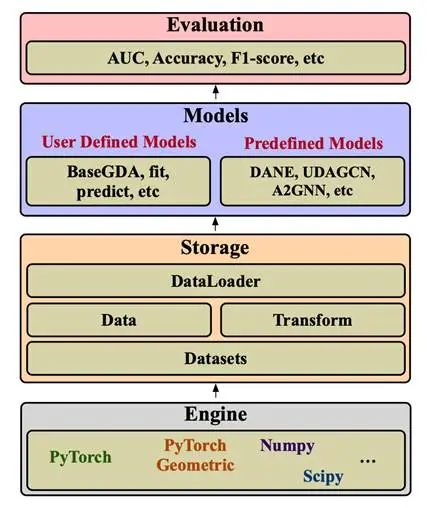 PyGDA简介 总的来说,PyGDA拥有一下几个特性: 1.覆盖图域自适应的完整流程:包括数据预处理、模型训练、评估等全流程操作,还支持在大图上的批量与采样式训练;