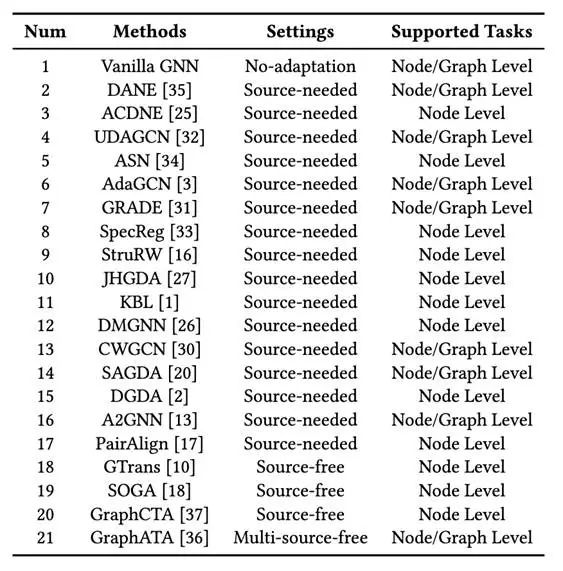 21个图域自适应算法 研究人员根据图域自适应任务的设置与特点,对 21 种主流算法进行了分类,具体如下表所示: