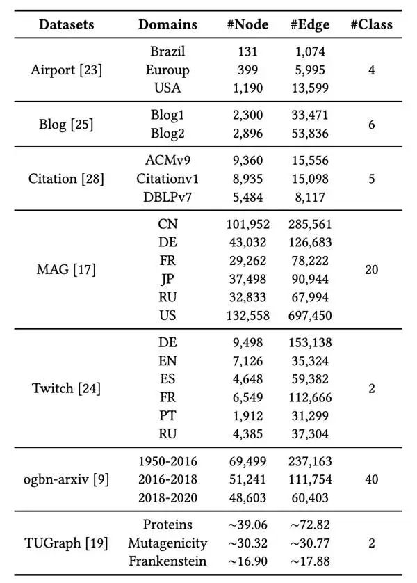 此外,仓库也持续更新,已集成如 A2GNN(AAAI 2024)、GraphATA(WWW 2025)等由社区贡献的最新图域自适应算法。 5类实验设置和26个数据集 PyGDA 支持多种实验场景,并配备多个类型丰富的数据集。通用代码被组织在 datasets/ 和 utils/ 目录中,便于后续扩展与自定义。 **1. **数据集涵盖多种图类型,包括社交网络、引文网络、蛋白质网络、交通网络等;