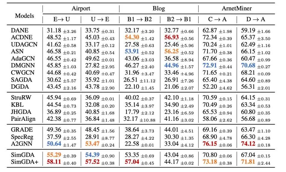 **2. **图分类与节点分类任务灵活切换:仅需通过参数设置 mode,其中 graph 表示图分类,node 表示节点分类(默认模式为 node); ‘’‘ model = A2GNN(in_dim=num_features, hid_dim=args.nhid, num_classes=num_classes, mode='graph', device=args.device) ’‘’ **3.**多源图自适应学习:只需将多个源域图作为输入传入 fit() 函数即可实现,使用便捷高效。 ‘’‘ model = GraphATA(in_dim=num_features, hid_dim=args.nhid, num_classes=num_classes, num_src_domains=n, device=args.device) model.fit([source_data, source_data2, ...], target_data) ‘‘’ 部分实验结果 为验证 PyGDA 实验平台的可用性,研究人员基于默认实验设置,展示了部分算法在典型场景下的表现,详见下表: