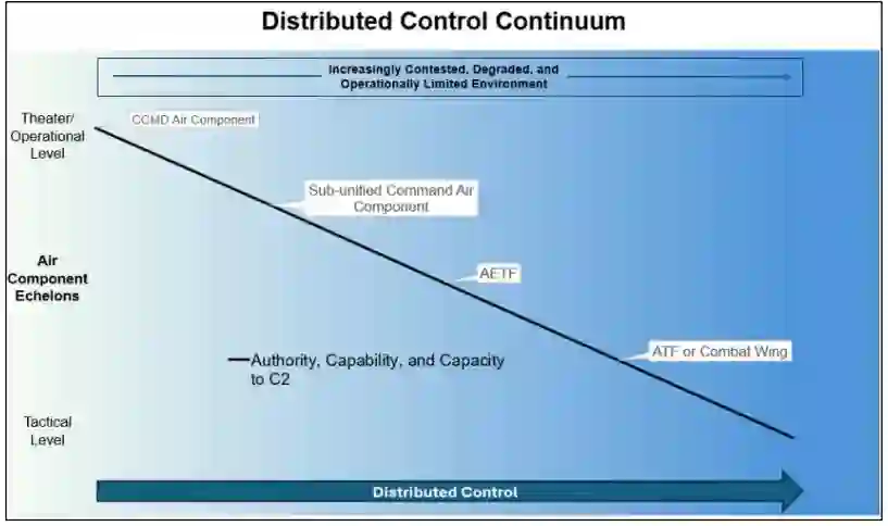 AFDP 3-0.1 通过这一模式介绍 C2,形成了任务指挥行动的完整图景。它通过解决 “什么是分布式控制、向谁分布式控制、为了什么目的分布式控制 ”这一问题,加深了对分布式控制的理解。其答案是 1)权力,2)下级指挥官,3)进行 C2 流程。这种不断发展的 C2 方法适用于美国空军各指挥层级的所有行动。