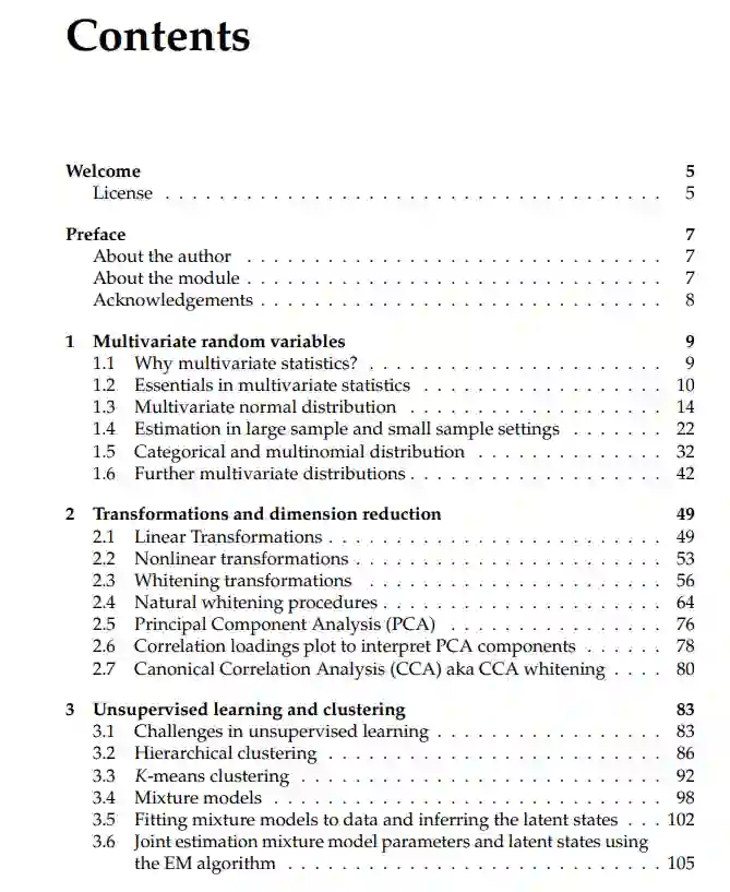 科学用实验来验证关于世界的假设。统计学提供了量化这一过程的工具,并提供了将数据(实验)与概率模型(假设)联系起来的方法。因为世界是复杂的,我们需要复杂的模型和复杂的数据,因此需要多元统计和机器学习。具体来说,多元统计(与单变量统计相反)涉及随机向量和随机矩阵的方法和模型,而不仅仅是随机单变量(标量)变量。因此,在多元统计中,我们经常使用矩阵表示法。与多元统计(传统统计学的一个分支)密切相关的是机器学习(ML),它传统上是计算机科学的一个分支。过去机器学习主要集中在算法上,而不是概率建模,但现在大多数机器学习方法都完全基于统计多元方法,因此这两个领域正在收敛。多变量模型提供了一种方法来学习随机变量组成部分之间的依赖关系和相互作用,这反过来使我们能够得出有关兴趣的潜在机制的结论(如生物或医学)。