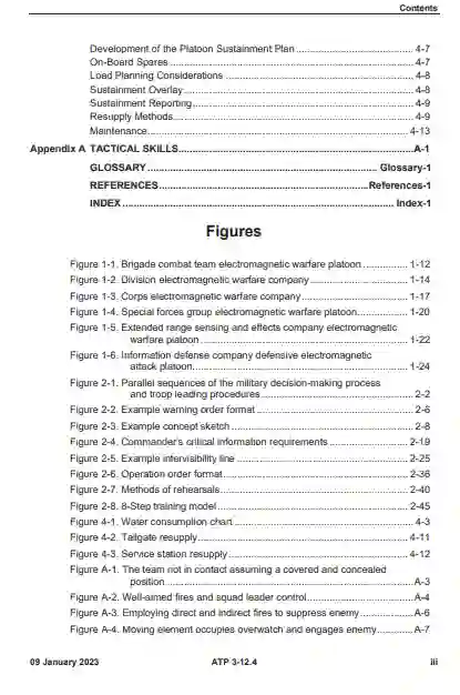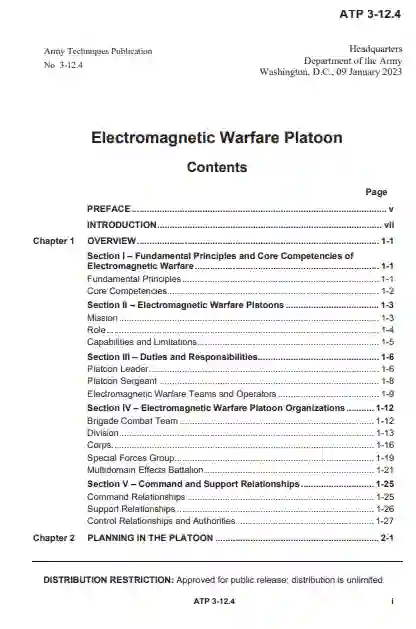 ATP 3-12.4为军团及以下梯队的电磁战排提供技术。该出版物提供了条令指导;描述了排内的关系;定义了组织角色、职能、能力和限制;并确定了电磁战排在军队行动中的责任。