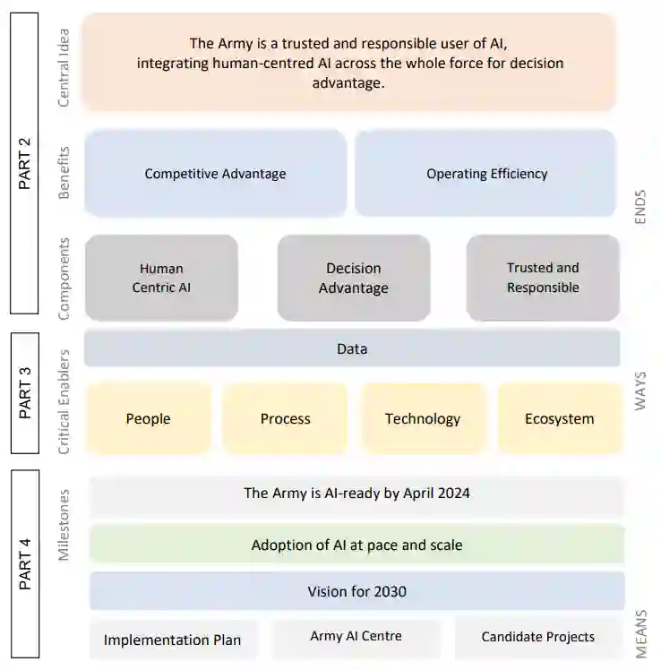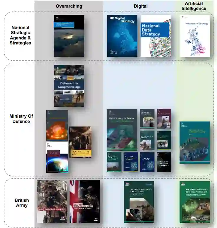 英国陆军的人工智能(AI)方法描述了根据国家和国防人工智能战略将人工智能作为一种综合军事能力提供所需的目的、方式和方法。它指导陆军发展人工智能,并向国防、盟国、工业界、学术界和政府各部门的合作伙伴(PAG)发出信号,表明陆军正在如何转型。它直接支持《2023-2025 年陆军数字化和数据计划》,并借鉴了多项数字化战略,包括《国防数字化战略》和《国防数据战略》。图 2 显示了关键文件之间的关系。