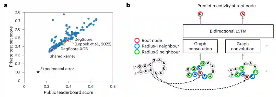 OpenVaccine竞赛独特地利用了Kaggle和Eterna两个互补的众包平台的资源。在这场比赛中,大多数顶级团队在私人排行榜上的排名与他们在公共排行榜上的排名接近相同。因此该结果表明这些模型是稳健且可推广的,并且使用单独的、独立收集的数据集进行私人排行榜测试,对于确保可推广性非常重要。