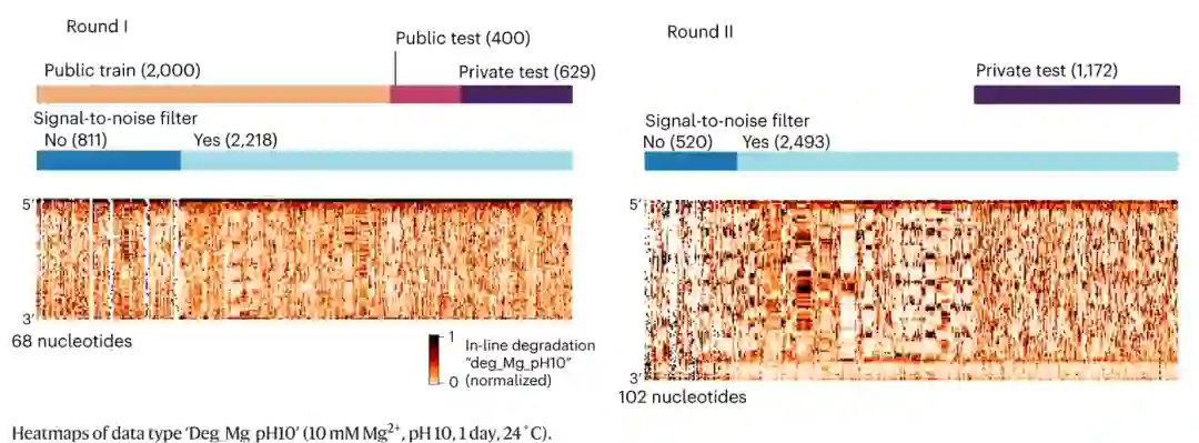 然而,任何此类mRNA设计算法的潜力都受到基础模型预测RNA降解的准确性的限制。这就需要掌握在短时间内RNA降解可实现的最大预测能力,以便进行模型开发。为此,我们结合了两个众包平台:RNA设计平台Eterna和机器学习竞赛平台Kaggle。