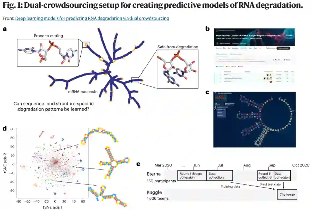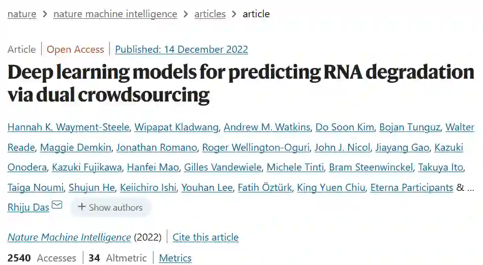 本文介绍一篇来自斯坦福大学的研究团队最近发表在Nature Machine intelligence期刊上名为”Deep learning models for predicting RNA degradation via dual crowdsourcing”的一项研究。作者巧妙地利用对两个众包平台的集成,获得能够对RNA降解进行极好预测的模型,以此来突破mRNA分子的热稳定性的限制。