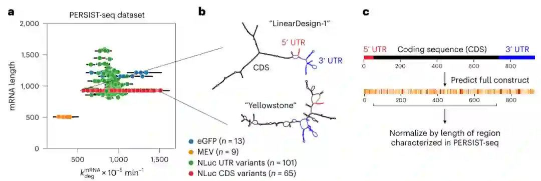 所得模型经受了两个盲测挑战。第一次是在Kaggle竞赛的背景下,参与者旨在预测的RNA结构探测和降解数据直到比赛宣布后才获得。在第二个盲测挑战中测试所得模型,预测编码多种模型蛋白的全长mRNA的整体降解。在预测这些总体降解率方面,这些模型的预测能力比现有方法更强。