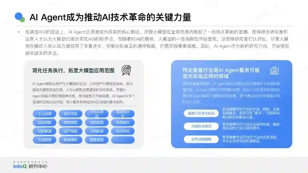 本研究将详细审视AGI在当前市场中的应用情况,特别是在营销、金融、教育、零售以及企业服务等关键行业领域。通过分析现有的应用案例,揭示AGI技术在实际业务场景中的具体应用程度和潜在价值。 随着人工智能技术的不断进步,人工通用智能(AGI)这一概念已经成为科技界和产业界热议的焦点。在本报告《中国 AGI 市场发展研究报告 2024》中,我们旨在深入解析 AGI 的发展历程和技术架构,并探讨 AI Agent 如何推动人工智能技术的演进,实现向 AGI 时代的跨越。