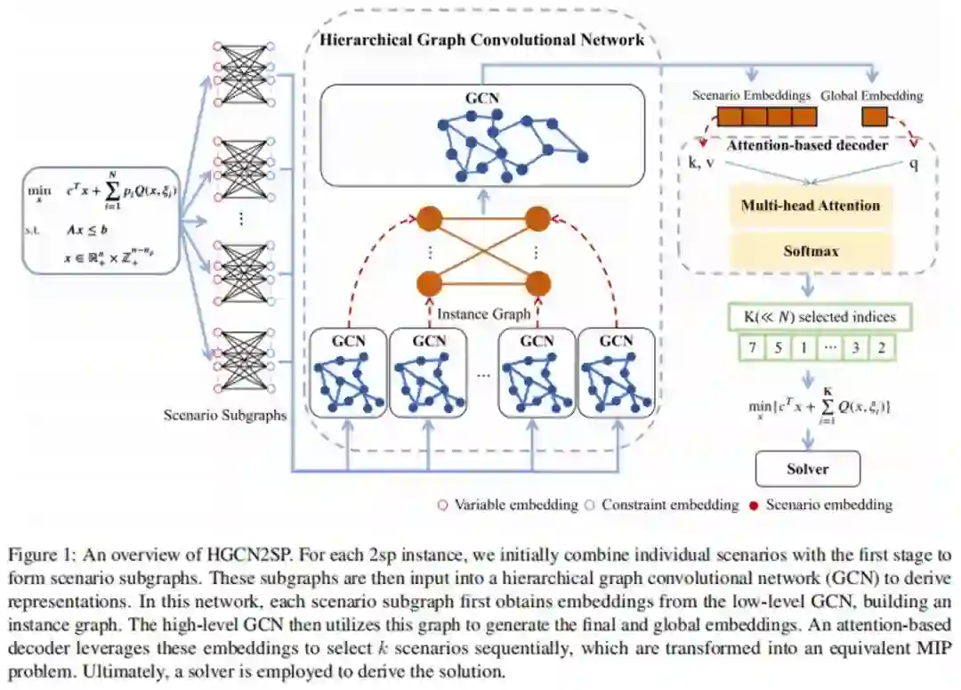 论文作者:吴洋,张一帆,梁振兴,程健 两阶段随机规划(Two-Stage Stochastic Programming, 2SP)是建模和求解不确定性下决策问题的有效方法。在这种情况下,决策者需要在不确定未来环境的情况下,先做出第一阶段的决策,然后根据实际发生的情况(场景)制定具体的第二阶段决策,以最小化总成本或最大化总收益。然而,随着场景数量的增加,问题规模迅速膨胀,导致求解时间显著增加。因此,如何高效求解成为了亟待解决的关键问题。 我们提出了HGCN2SP模型,该模型利用层次化图卷积网络提取场景的表征,采用基于注意力机制的解码器挑选代表性的场景,并结合强化学习(RL)优化其选择,实现了2SP问题的高效求解。在设施选址问题上的实验表明,HGCN2SP能够做出比现有方法更优的决策。在网络设计问题的实验中,HGCN2SP仅用不到一半的时间就取得了相近的决策效果。尤其在大规模实例和大量场景的情况下,HGCN2SP依然保持了强大的泛化能力。