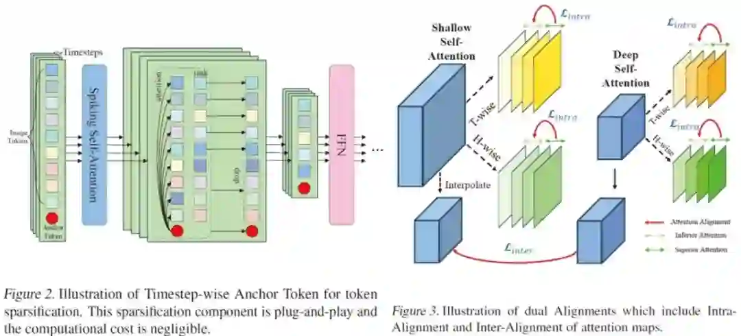 Towards Efficient Spiking Transformer: A Token Sparsification Framework for Training and Inference Acceleration 论文作者:诸葛正阳,王培松,姚星廷,程健 当前的脉冲Transformer在具有脉冲神经网络能效优势的同时,还展现出了逼近人工神经网络的卓越性能。然而,虽然能通过神经形态计算实现能耗高效的推理过程,但脉冲Transformer在GPU上的训练过程相比于人工神经网络需要消耗更多时间。 为了解决该问题,我们探索了针对高效脉冲Transformer的令牌稀疏化方案,并发现传统稀疏化方法存在明显的性能下降问题。我们对此问题进行了分析并提出了基于时间步锚定令牌与双对齐的稀疏化方法(STATA),使用更加标准化的准则在时间步维度上识别重要的令牌,并通过双对齐机制促进多个维度上较弱注意力图的学习,进一步保证了令牌稀疏化的准确性。实验结果表明,STATA在脉冲Transformer的训练和推理过程显著优于传统的稀疏化方法。它在保持了一定模型性能的基础上,实现了约1.53倍的训练提速和48%的推理能耗节省,同时它还在多种数据集和架构上具有较好的可迁移性。