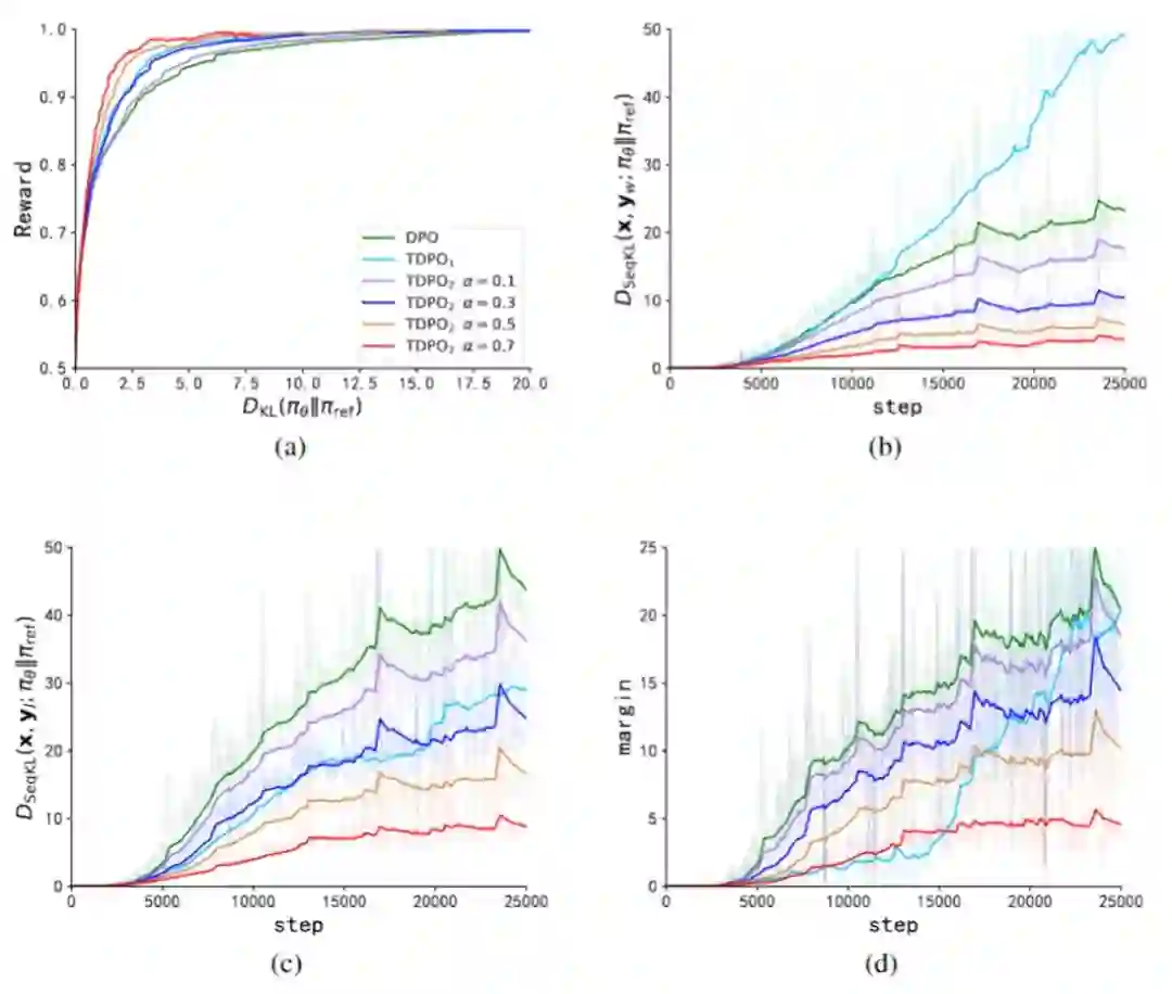 图 2:IMDb数据集上的实验。图3(a)表示相对于参考模型的预期回报和KL散度的帕累托前沿。我们针对参数α实施了DPO、TDPO1以及TDPO2的不同版本。就帕累托前沿而言,TDPO1和TDPO2均优于DPO,其中TDPO2相对于TDPO1进一步提高了性能。这证明了我们的分析和修改的有效性。图3(b)和图3(c)分别展示了在训练步骤中,偏好和不偏好响应子集的序列KL散度的演变情况。图3(d)展示了在整个训练过程中,不偏好响应子集的序列KL散度与偏好响应子集的序列KL散度之间的差异。与TDPO1和DPO算法相比,TDPO2在KL散度的调节方面表现出了优越性。