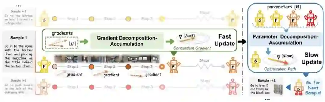 论文作者:高君宇,姚暄,徐常胜 视觉-语言导航作为实现具身智能的关键研究方向,专注于探索智能体如何准确理解自然语言指令并导航至目标位置。在实际中,智能体通常需要以在线的方式执行视觉-语言导航任务,即完成跨样本的在线指令执行和单样本内的多步动作决策。由于仅依赖预训练和固定的导航模型难以满足多样化的测试环境,这促使我们探索如何利用未标注的测试样本来实现有效的在线模型适应。然而,过于频繁的模型更新可能导致模型参数发生显著变化,而偶尔的更新又可能使模型难以适应动态变化的环境。 为此,本文提出了一种新的快-慢测试时自适应方法(FSTTA),该方法在统一框架下对模型梯度和参数进行联合的分解与累积分析,以应对在线视觉语言导航任务的挑战。通过大量实验验证,本文提出的方法在四个流行的基准测试中均取得了显著的性能提升。