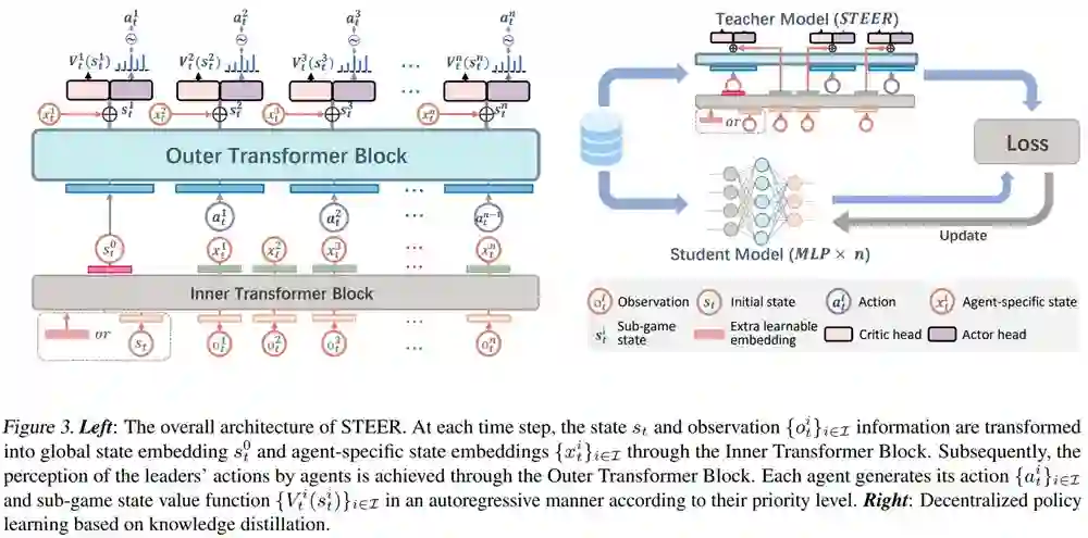 论文作者:张斌,毛航宇,李丽娟,徐志伟,李大鹏,赵瑞,范国梁 在多智能体系统中,智能体不仅需要最大化自身奖励,还需与其他智能体动态协调,以实现最佳联合策略。现有的MARL方法大多假设智能体之间的同步动作,限制了其在复杂场景中的应用。 这篇文章探讨了多智能体系统中的异步动作协调问题。作者提出了一种新的方法—Stackelberg Decision Transformer(STEER),旨在通过结合斯塔克尔伯格博弈的层次决策结构和自回归序列模型的建模能力,来提高多智能体强化学习方法的可扩展性。STEER引入了双Transformer架构,其中内部Transformer块能够实现博弈抽象,有效处理不同环境下的状态配置,外部Transformer块则促进了每个智能体策略函数和价值函数的自回归拟合。这种架构还能够并行更新所有智能体的策略,大幅降低了之前基于斯塔克尔伯格博弈博弈的强化学习方法的计算成本。此外,文章还提出了知识蒸馏方案来实现其在分散式执行系统中的部署。
