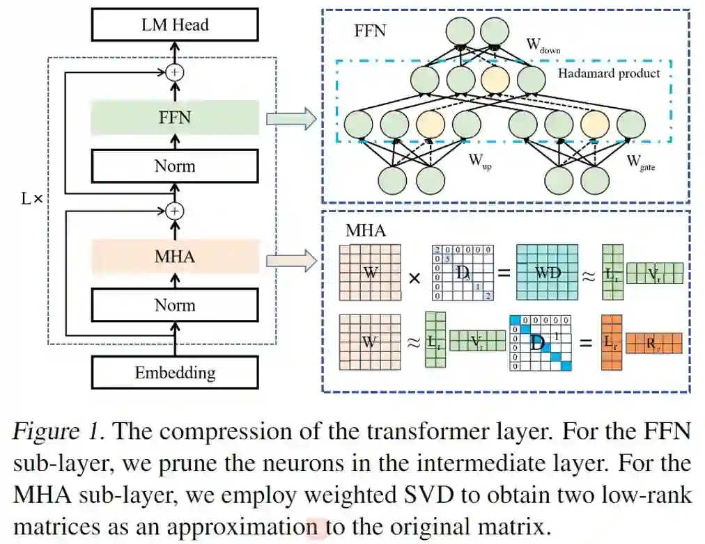 LoRAP: Transformer Sub-Layers Deserve Differentiated Structured Compression for Large Language Models 论文作者:李广焱,唐永强,张文生 Transformer的结构化压缩往往采用单一的压缩方法,从而忽略了Transformer中不同子层之间的结构特性。为了解决该问题,本文设计了一种新颖的结构化压缩方法 LoRAP,它有机地结合了低秩矩阵近似和结构化剪枝。这项研究中得出了一个重要观察:多头自注意力(MHA)子层显示出明显的低秩结构,而前馈网络(FFN)子层则没有。基于这一观察,对于MHA子层,本文提出了一种输入激活加权奇异值分解方法,并根据矩阵低秩属性的差异分配不同的参数量。对于FFN子层,本文提出了一种梯度无关的结构化通道剪枝方法。在零样本困惑度和零样本任务分类的广泛评估中,本文的方法在多个压缩比下均优于之前的结构化压缩方法。