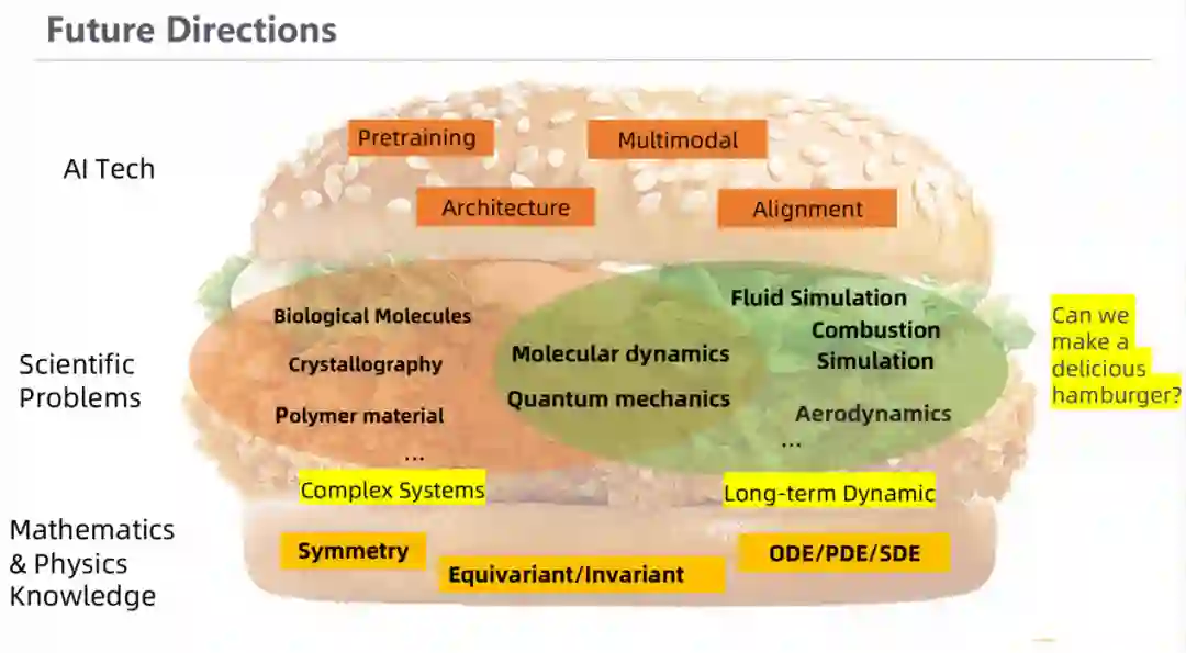 AI for Science领域的大模型应该怎样做?在我看来,科学问题涵盖的领域非常广泛,从生物到物理。其问题的尺度和复杂性也各有不同,大到天体,小到微粒。在过去数百年的研究中,科学家们已经积攒了非常丰富的多尺度数据,那么我们能否通过融入一定的先验知识,研发出多模态、多尺度大模型,从而打通各个领域,助力科学发现呢? 如果能实现,那么我们就可能通过分子动力学模拟去预测蛋白结构,通过蛋白质结构预测催化系统的结合能。 我们有强大的算力和性能优异的算法,我们也有长久积累下来的物理学定律,如何用这两块面包,解决很多重要的科学问题(里面的鸡排),从而做好这个汉堡包,获得新的科学范式,是各位研究者们未来奋斗的目标。