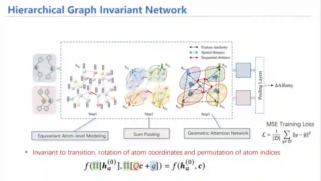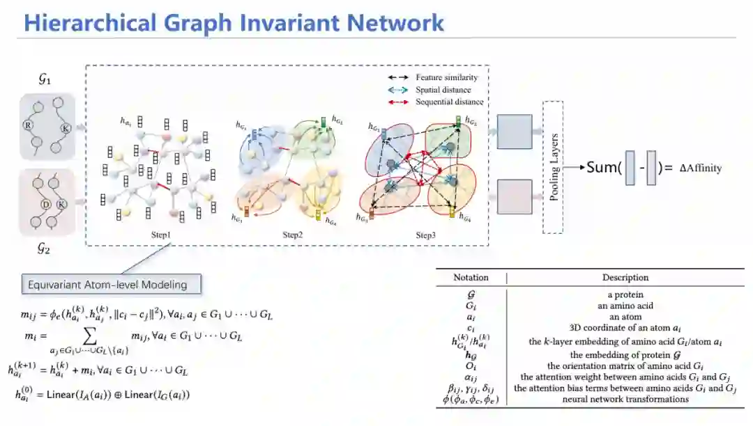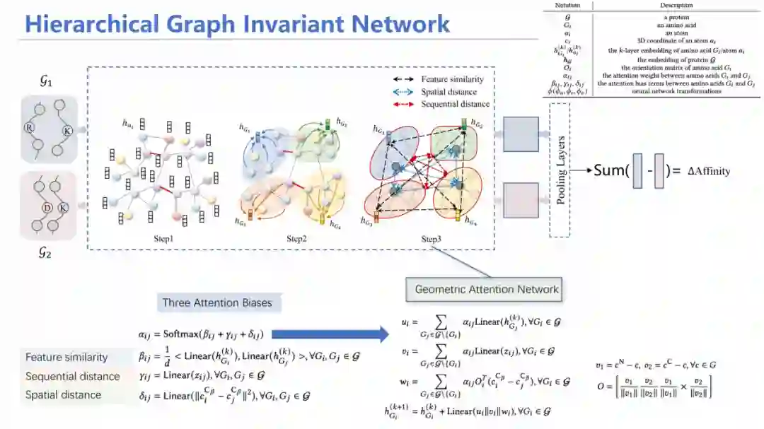 为此,我们设计了HGIN——层次等变图神经网络模型。模型同时输入野生型和突变型结构,首先从原子层面进行消息聚合,随后通过池化(Pooling)方式将其汇总到每个氨基酸的特征;在氨基酸层面,考虑氨基酸之间的特征相似性、空间上是否相近、在序列上的位置等多角度信息进行注意力机制加权平均求和,最后预测出两个潜在表示,加上MLP层预测亲和力变化情况,同原来已知的标签进行监督学习。