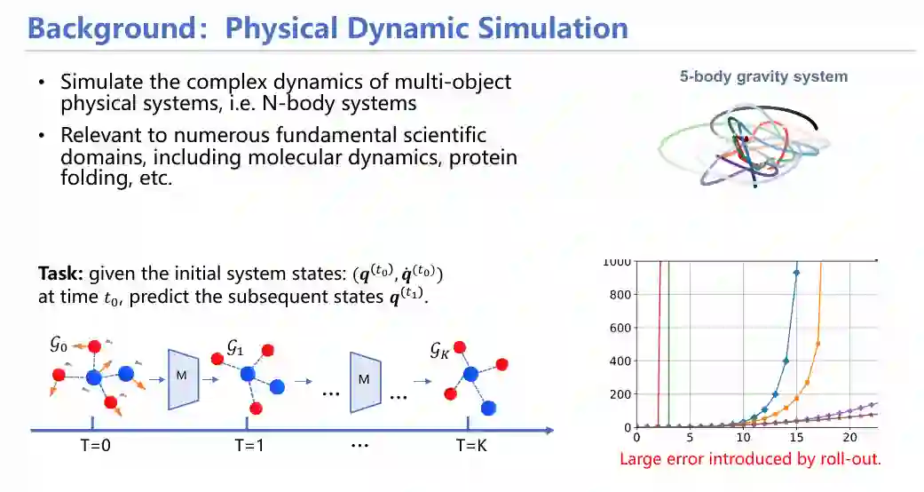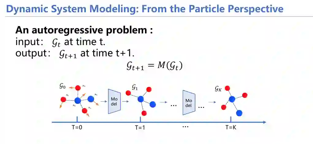 在建模动态系统时,物理学家能够运用经典物理规律(如牛顿第二定律)对每个粒子的运动进行模拟。然而,随着粒子数的增加,计算复杂性急剧上升,这对计算资源的要求更为苛刻。此外,随着时间和迭代次数的增加,每一步的误差会逐渐累积,直至系统崩溃。这两点困难使得长时程预测任务难度骤然上升。