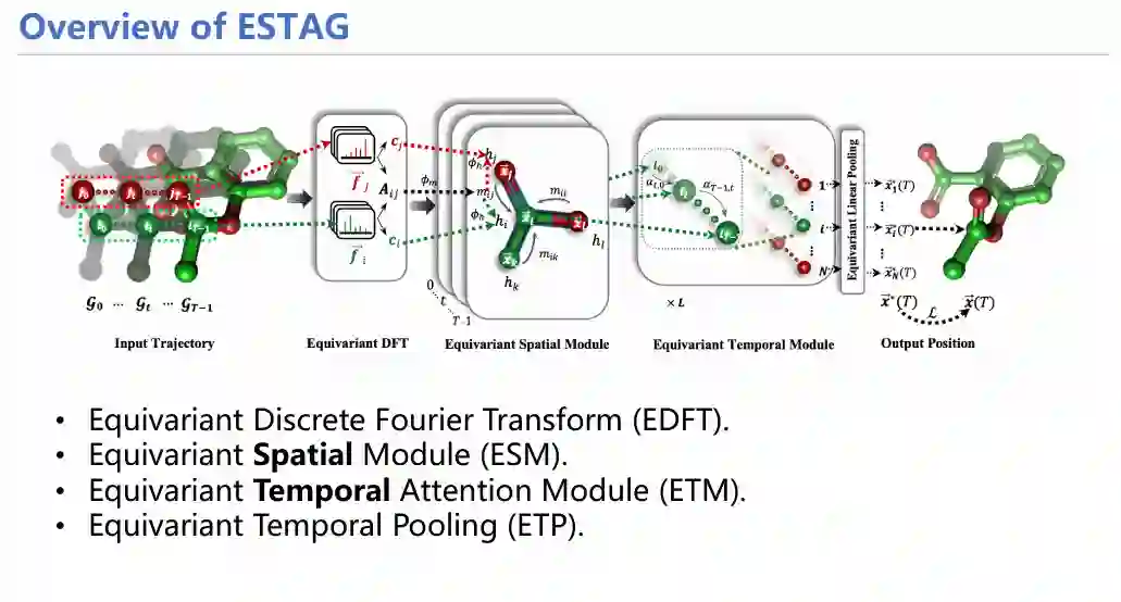 鉴于此,我们开发了一种融合时空信息的等变图神经网络框架ESTAG,用于进行粒子模拟。此框架分为四个部分:
