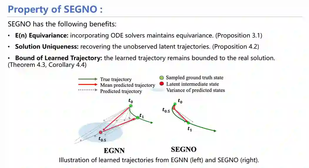 在理论证明上,SEGNO能够证实模型具有等变性,解唯一性;且通过下图实验可看出与传统的EGNN相比,SEGNO在可以保证在t0-t1过程中的路径唯一性,同时这一路径也可以准确预测t0.5这个中间量。