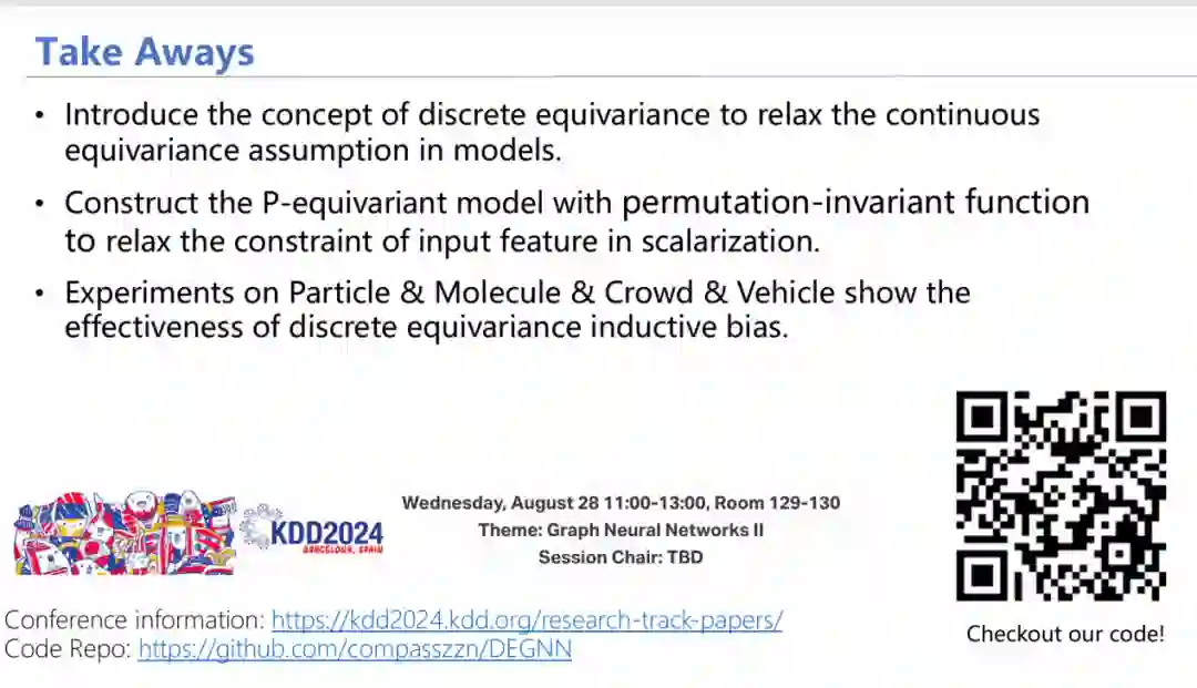 参考文献:[1] Satorras, Vıctor Garcia, Emiel Hoogeboom, and Max Welling. "E (n) equivariant graph neural networks." International conference on machine learning. PMLR, 2021[2] Liu, Yang, et al. "SEGNO: Generalizing Equivariant Graph Neural Networks with Physical Inductive Biases." The Twelfth International Conference on Learning Representations, 2024, https://openreview.net/forum?id=3oTPsORaDH.[3] Wu, Liming, et al. "Equivariant Spatio-Temporal Attentive Graph Networks to Simulate Physical Dynamics." Thirty-seventh Conference on Neural Information Processing Systems, 2023, https://openreview.net/forum?id=35nFSbEBks.[4] Zheng, Zinan, et al. "Relaxing Continuous Constraints of Equivariant Graph Neural Networks for Physical Dynamics Learning." ArXiv, 2024, https://arxiv.org/abs/2406.16295.[5] Zhao, Kangfei, et al. "Geometric Graph Learning for Protein Mutation Effect Prediction." Proceedings of the 32nd ACM International Conference on Information and Knowledge Management, ACM, 2023, pp. 3412–3422, https://doi.org/10.1145/3583780.3614893[6] Han, Jiaqi, et al. "A Survey of Geometric Graph Neural Networks: Data Structures, Models and Applications." arXiv, 2024, https://arxiv.org/abs/2403.00485.[7] Mondal, Arnab Kumar, et al. "Group Equivariant Deep Reinforcement Learning." arXiv preprint arXiv, 2020, https://arxiv.org/abs/2007.03437.