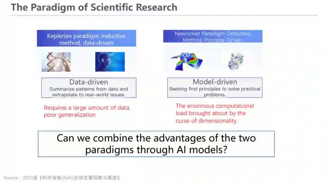 科学研究的范式可分为两类:一类是开普勒的数据驱动型——给定大批数据,通过AI模型学习底层规律;另一类是牛顿的模型驱动型——从第一性原理开始推导,建立理论框架。在当今的研究中,我们是否能将这两种范式进行结合呢?能否通过注入物理先验知识,在有限的数据下训练出一个“足够聪明”的大模型呢?值得大家思考。