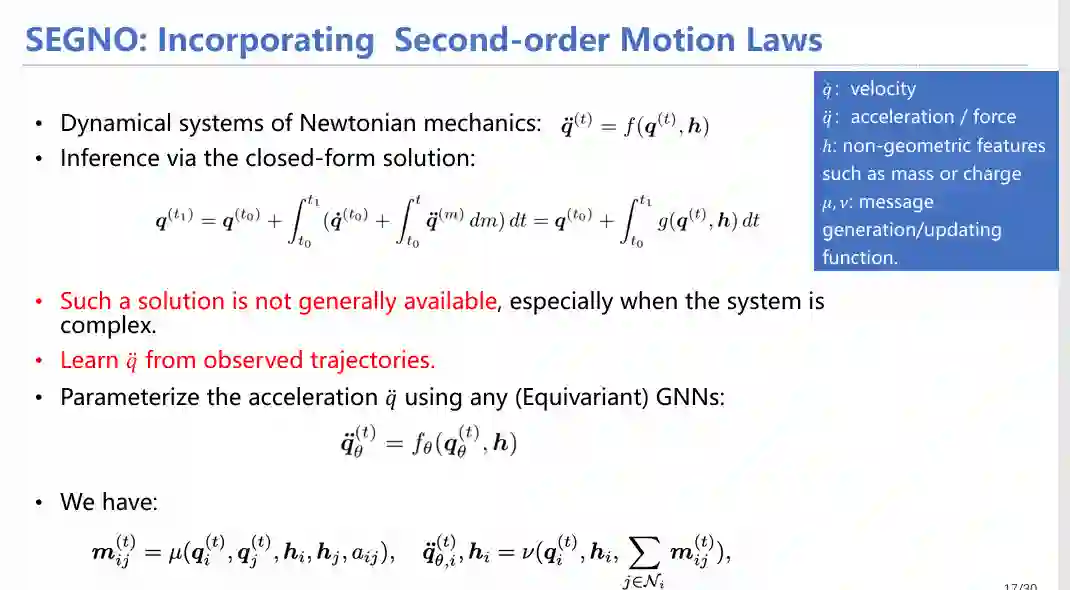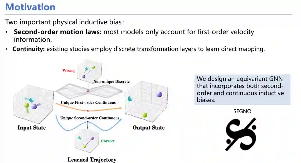 经过文献调研与细致分析,我们发现有两点先验知识之前没有涉及:1)许多模型仅关注从前一时刻的位置预测后一时刻的位置(仅有一阶信息)。然而在物理学领域,逻辑应该是:分析受力-得到加速度-求解速度-求解位移,应该增加对加速度的预测和考量(二阶信息);2)现有数据极其稀疏,仅有这一时刻和下一时刻的离散化数据,至于中间经历了什么无法知晓。针对这两点局限,我们设计了SEGNO框架,将两种先验假设融入模型中。
