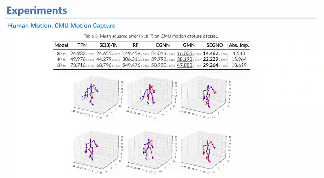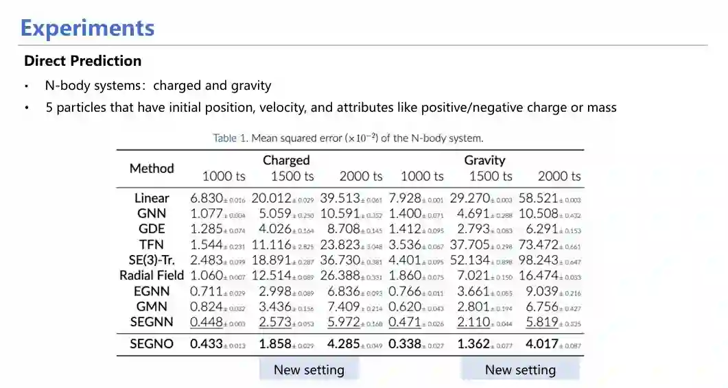 从具体实验来看,SEGNO不仅能在定量实验(如方向预测实验)中取得较高指标,均方误差(MSE)较小;同时也十分稳定,具体表现在随着迭代次数增加,SEGNO的误差增长曲线较其他模型更为平缓,证明其每一步的误差均控制在较小范围。
