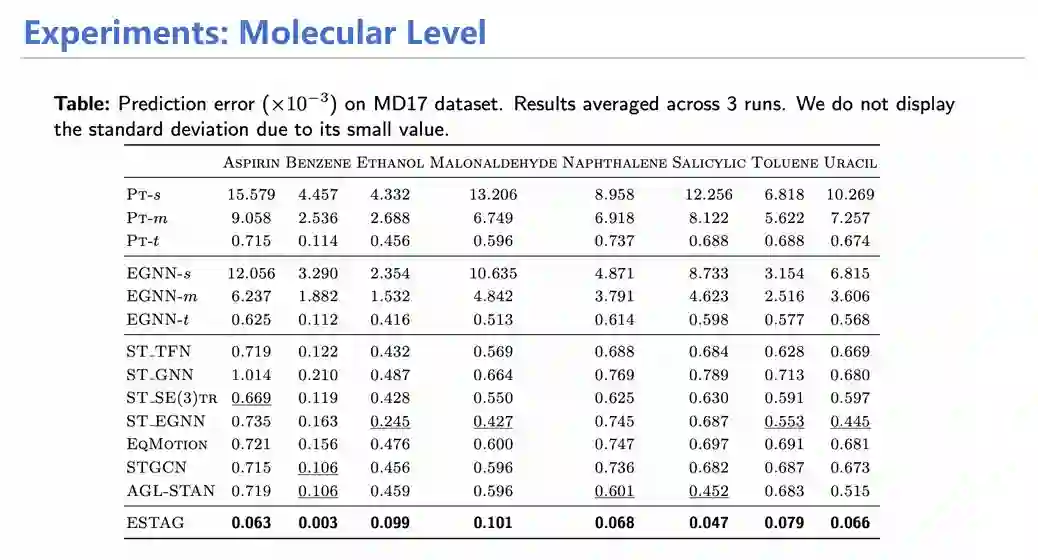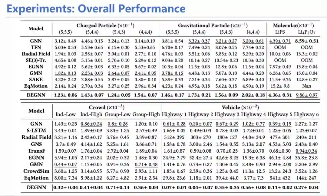 我们采用这样的构造方式搭建模型,并进行了从宏观到微观的不同物理系统(如高速公路、分子动力学)的实验。结果证明,模型在各个领域的实验均表现优异,从而证实本研究开头提到的假设:等变性约束往往太过严格,适当放松约束也是不错的选择,为未来模型设计和研究提供了参考。