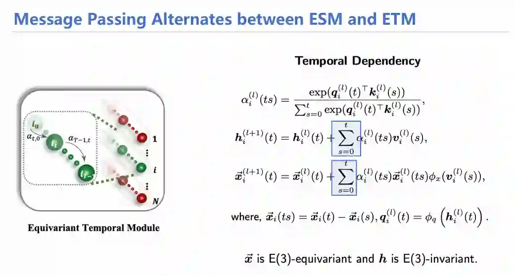 下面两张图大体概括了时空传递机制,其实和EGNN的方式大体相当,只不过在时间信息传递时采用了注意力机制,对从0时刻开始的状态(坐标,速度)进行加权求和,随后生成信息用于下一次传递。