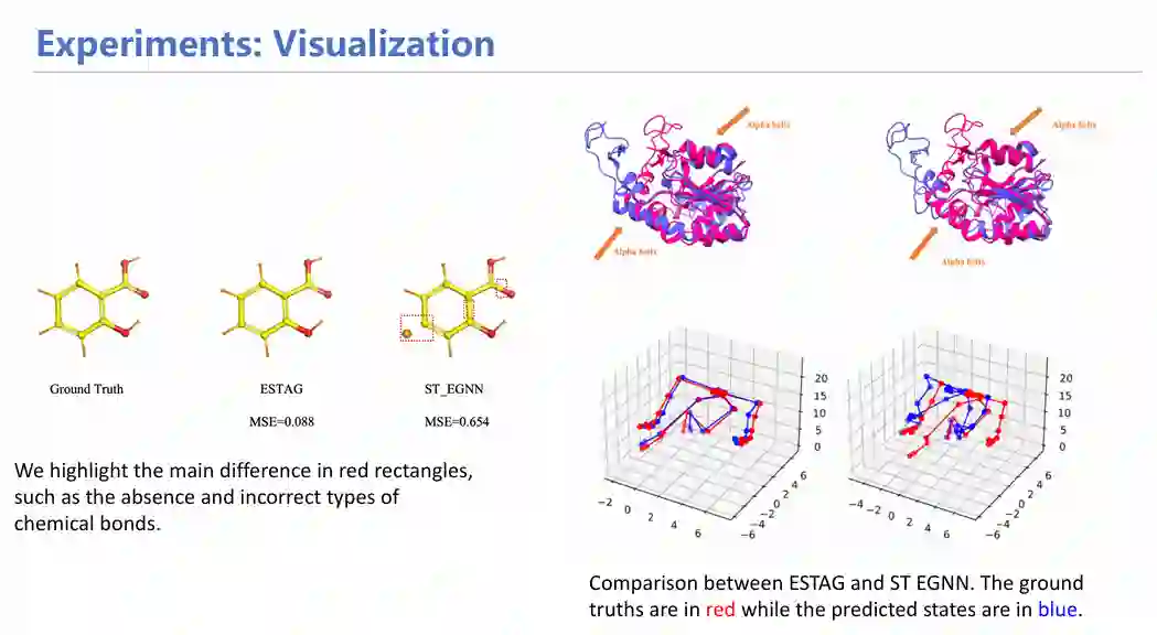 通过在分子模拟数据集MD17上的实验,我们证实了融合时空信息确实能够让模拟性能提升一个数量级,从更宏观的蛋白数据集上也收获到了类似的效果。可视化实验也证明了ESTAG能够在预测过程中保留EGNN丢失的化学键,并能更精确地生成蛋白质alpha折叠和人体姿态数据。